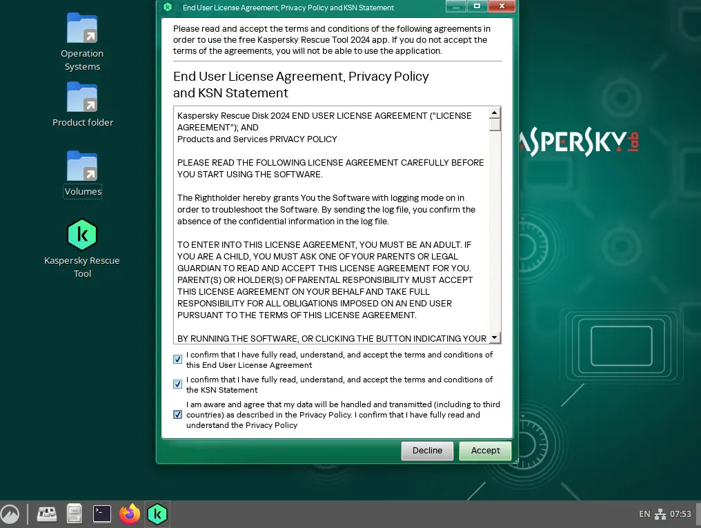 Sau khi hệ thống khởi động xong bạn sẽ vào được môi trường cứu hộ của Kaspersky và một bảng thỏa thuận đồng ý sử dụng và bảo mật được hiển thị như hình. Bạn check vào tất cả và chọn Accept để chấp nhận các điều khoản: