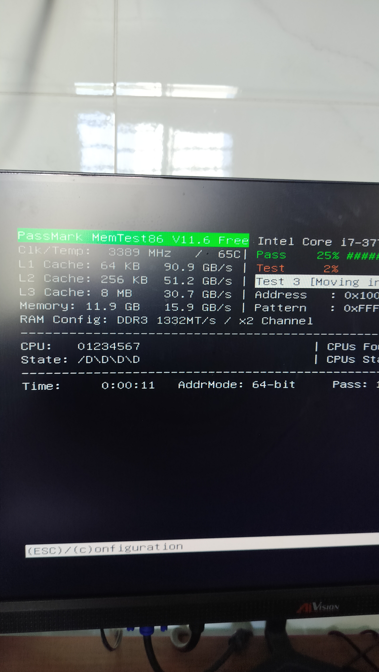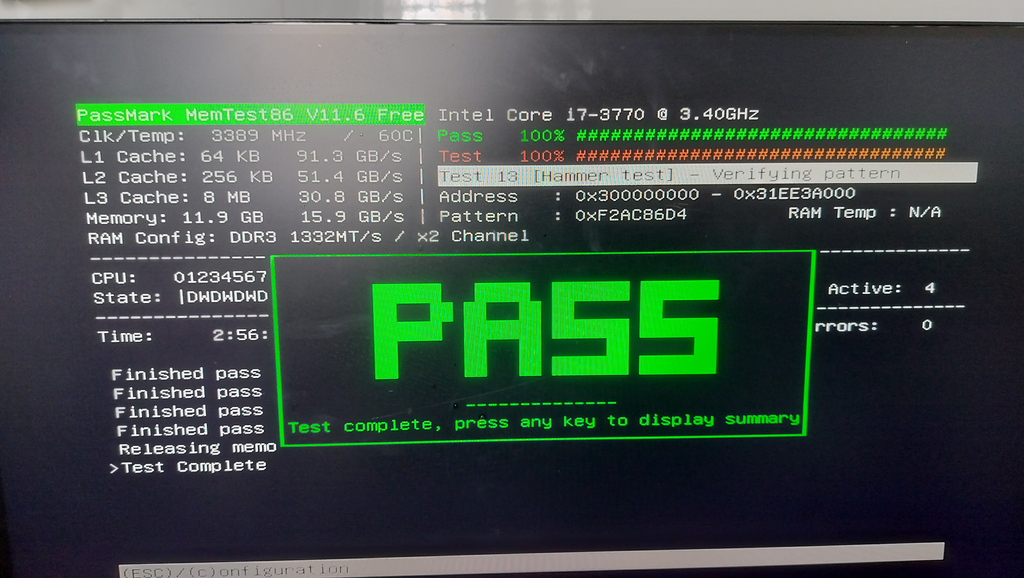 Chỉ cần chạy MemTest trên usb boot và để chương trình kiểm tra trong một thời gian để xác định tình trạng RAM. Sau một khoảng thời gian ví dụ như cấu hình của mình ram 12Gb và cpu i7-3770. Quá trình này diễn ra gần 3 giờ đồng hồ. Nếu mọi thứ đều bình thường bạn sẽ nhận được thông báo như hình.