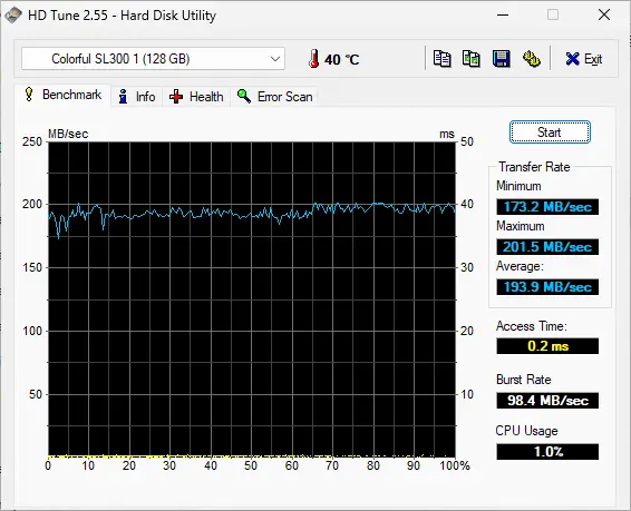 Sau khi khởi chạy HDD Tune chúng ta chọn Start và Chời đợi kết quả hiển thị như sau: