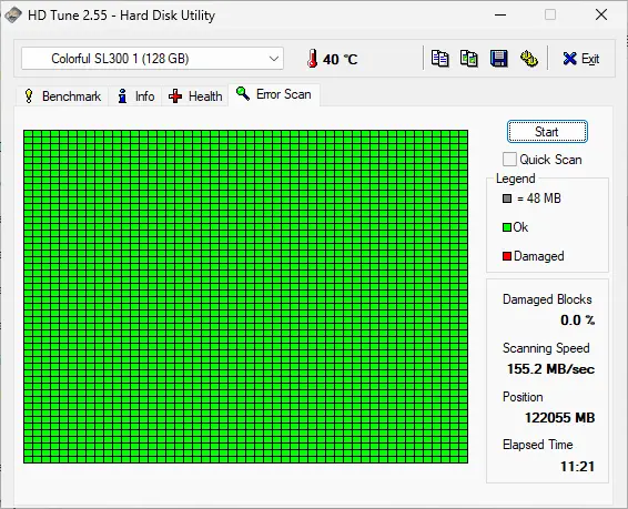 Ở đây chúng ta có thể kiểm tra các block ổ cứng trên hdd. Nhưng vì cơ chế của ssd đã khác với cơ chế của hdd. nên với một chiếc hdd sử dụng lâu có thể sẽ kiểm tra được các block bị bad (màu đỏ). Phân vùng còn khỏe sẽ có màu xanh như hình.