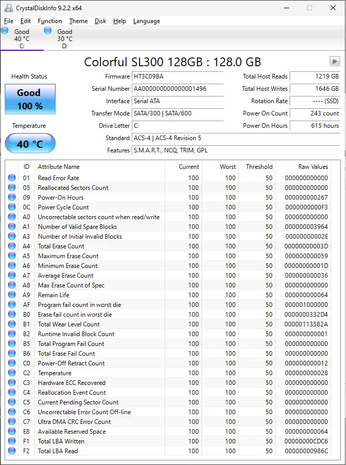 Sau khi khởi chạy Crystal Disk Info bạn sẽ được một bảng hiển thị thông báo các thông số về tình trạng ổ cứng hiện tại như sau: