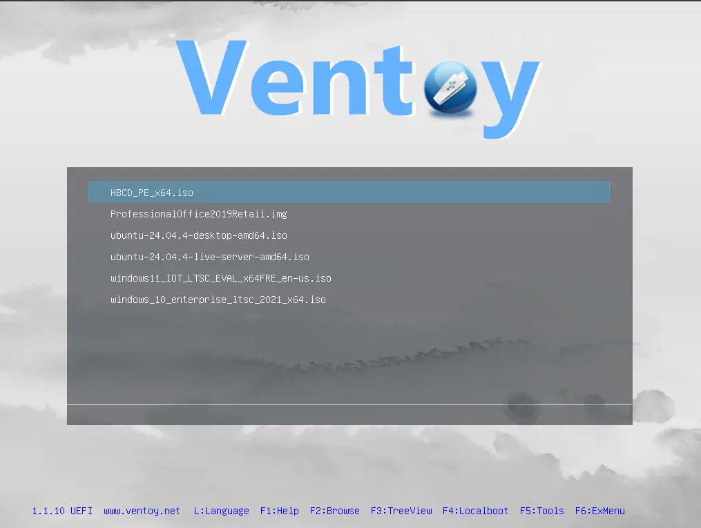 Menu các file iso bạn đã download và copy trên USB cứu hộ Ventoy
